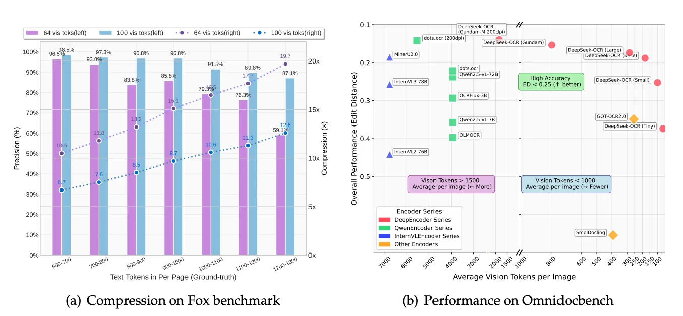 DeepSeek-OCR is an open-source OCR model that uses "optical compression" to process documents 10x more efficiently than competing models. It achieves 97% accuracy while using only 100 vision tokens per page, compared to 256+ tokens for other state-of-the-art models like GOT-OCR 2.0 and 6,000+ tokens for MinerU 2.0. This enables faster inference, lower computational costs, and more efficient document processing pipelines.